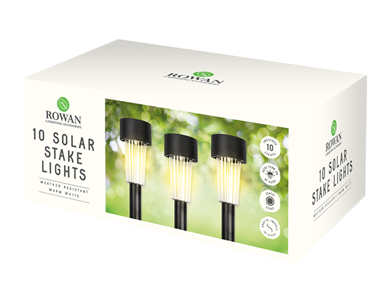 Each box includes x10 solar stake lights that are easy to install with no wires required. Position the solar lights in a location with direct sunlight to receive optimal performance.