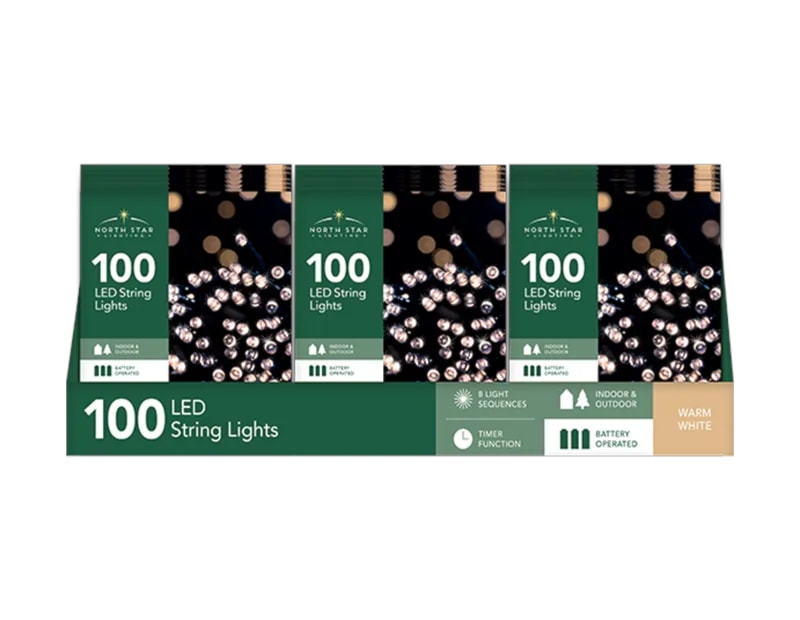 A high-impact lighting option for festive displays, these 100 LED battery-operated string lights feature warm white illumination on a durable black wire. Designed for versatility, they offer eight selectable lighting functions—including twinkle, chasing, and steady on—alongside a convenient 6-hour timer for automated daily operation. Powered by 3 x AA batteries (not included), the insulated battery compartment includes an easy-access control button and an integrated hanging hook.
