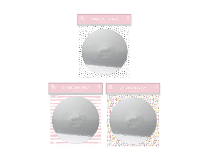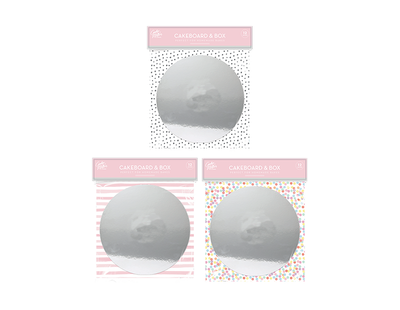 Perfect for the keen home baker, the set comprises a 12" diameter foiled cake board constructed from rigid cardboard, together with a box and lid which are decorated with a striped pattern.
