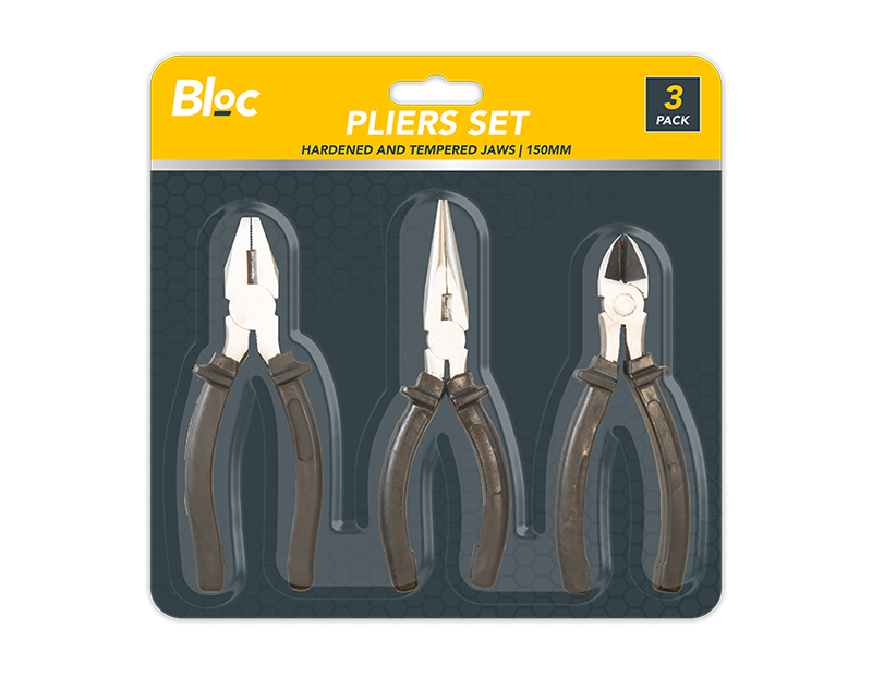 Each three piece plier set includes combination, long nose and side cutting pliers, each with hardened and tempered 150mm jaws, induction hardened cutting edges, moulded handles and finger guards. Each pair of pliers has the Bloc logo printed on the head.