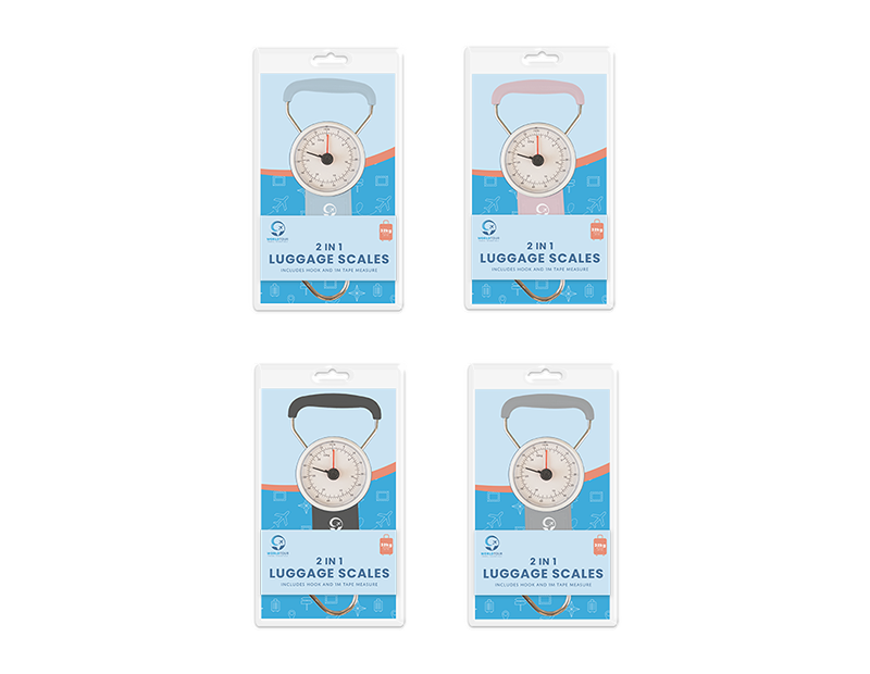 Each baggage scale set includes a luggage hook and a 1 metre tape measure.