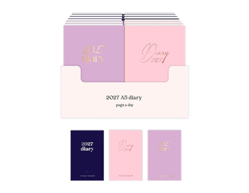 Each A5 diary has a page for every day of the year for 2027 and also features yearly calendars, a planner, pages for personal details, notable public holidays and international details.