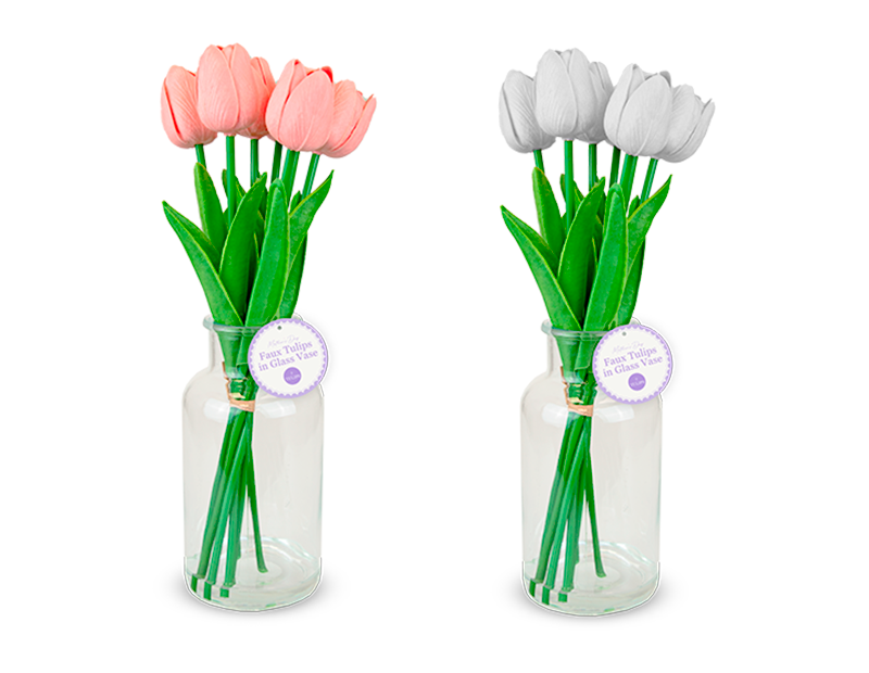 A perfect gift for Mother's Day. These faux tulips are constructed from coloured foam that is textured to resemble real flowers, and comes complete with a glass vase.
