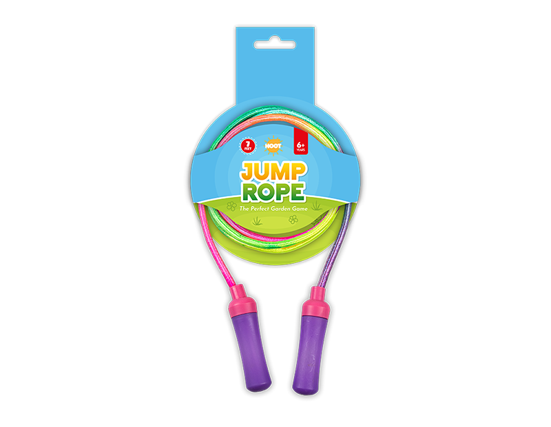 Each jump rope measures 7 foot in length in a fun rainbow colour with purple and pink handles.