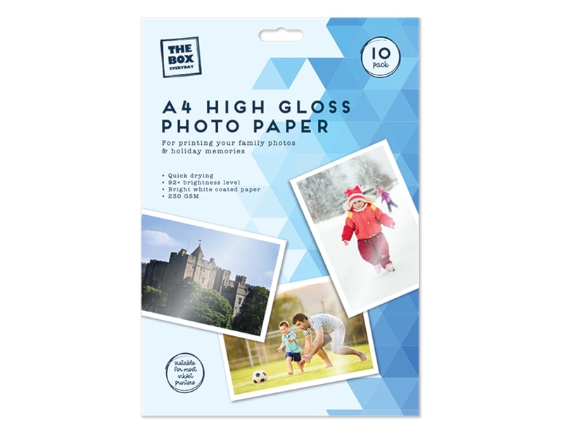 This pack of High Gloss Photo Paper contains ten A4 (29.7cm x 21cm) 230GSM sheets of quick-drying paper suitable for most inkjet printers.