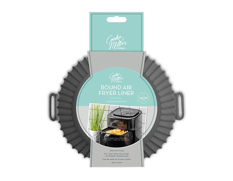 This round silicone air fryer liner has an approximate diameter of 16cm and will easily fit into most types of roud air fryer. Each liner features a textured bottom and two handles, and is also suitable for dishwasher and microwave.