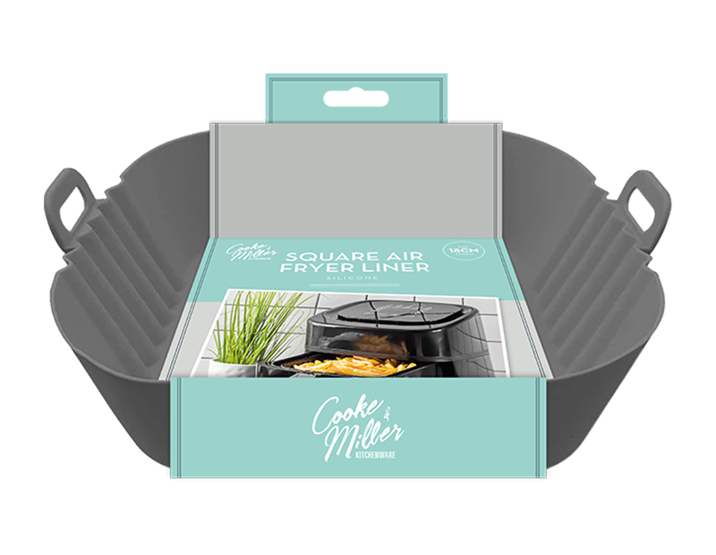 This square silicone air fryer liner has an approximate size of 18 x 18cm and will easily fit into most types of air fryer. Each liner features a textured bottom and two handles, and is also suitable for dishwasher and microwave.