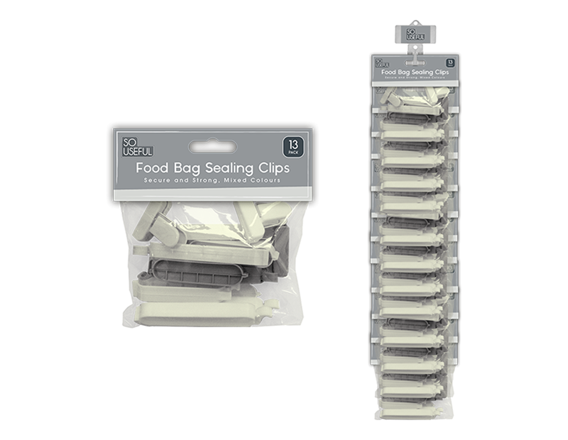 These bag clips are designed to help keep contents fresher for longer. Each pack contains an assortment of 13 sealing clips. Each with rectangle and T-shaped clips for a variety of food and uses.