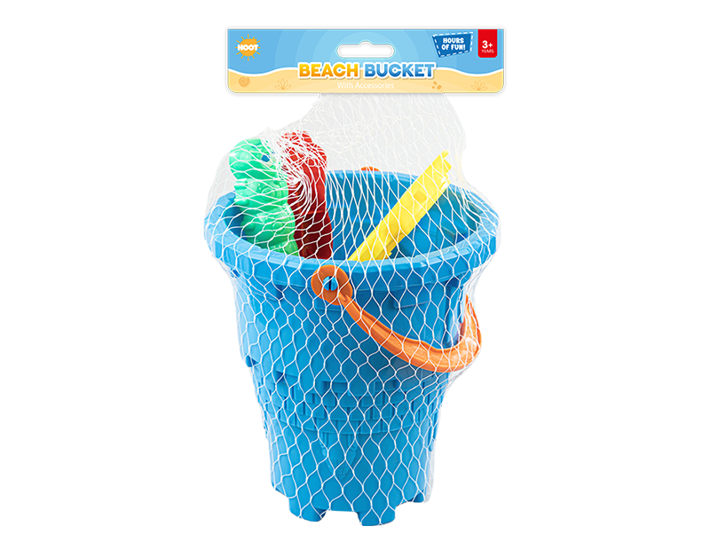 The perfect beach set for kids, this beach bucket sandcastle set includes a bucket, rake, and spade featuring fun character handles, a water sieve, a watering can, and two sand moulds.