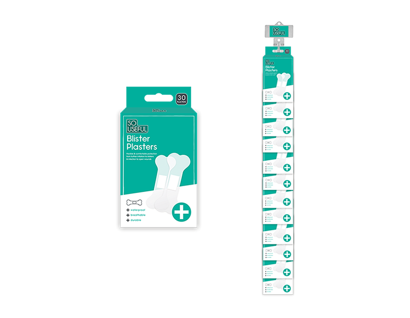 This pack of Blister Plasters contains thirty individual plasters that are flexible, and durable. Each plaster is comfortable, and offers protection against further irritation to blisters and infection to open wounds.