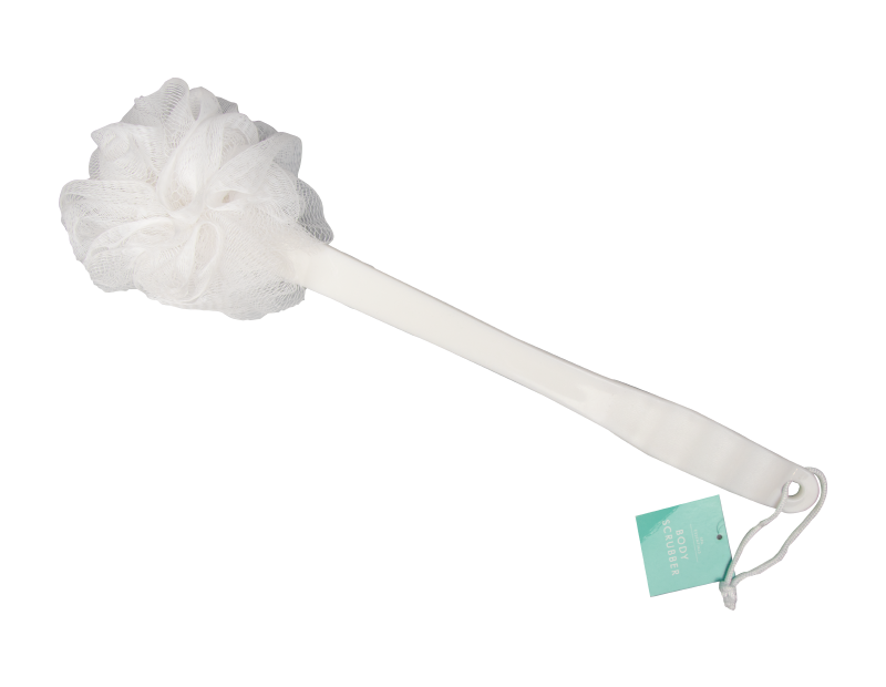 The scrubber brush is constructed with a long plastic handle which is ideal for hard to reach places and is complete with an attached exfoliating ruffle that is perfect for leaving skin refreshed and smooth.