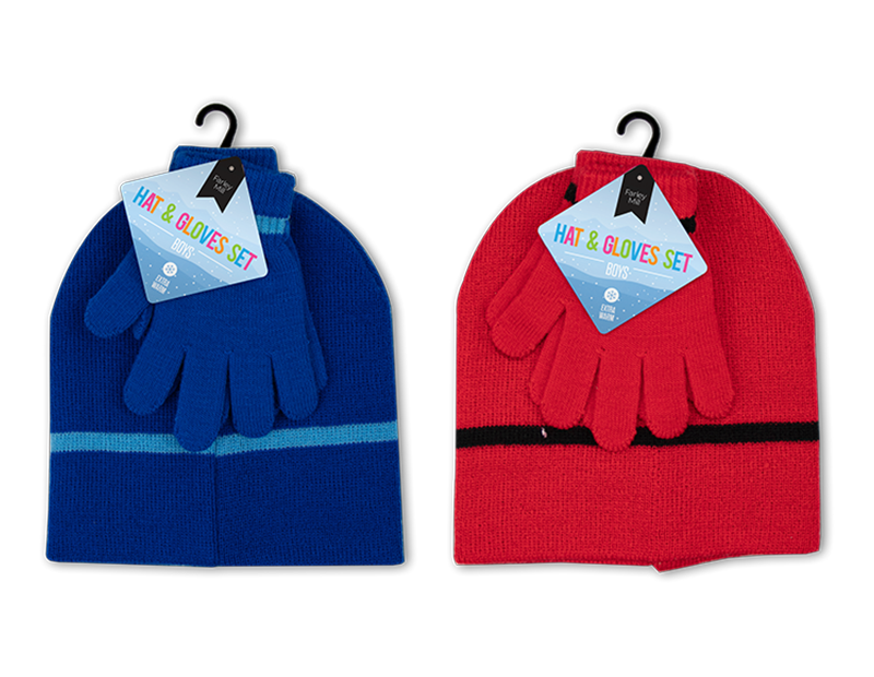 These Boys Beanie Hat & Gloves Sets contains a pair of gloves and a beanie hat, each with an acrylic and polyester construction.