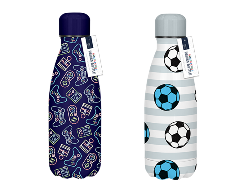 Each bottle has a 350ml capacity, perfectly sized for school bags and lunch packs, and features a durable metal construction that helps keep cold drinks cool for up to 24 hours. Each carton contains two designs, including football and video games, with coloured lids.