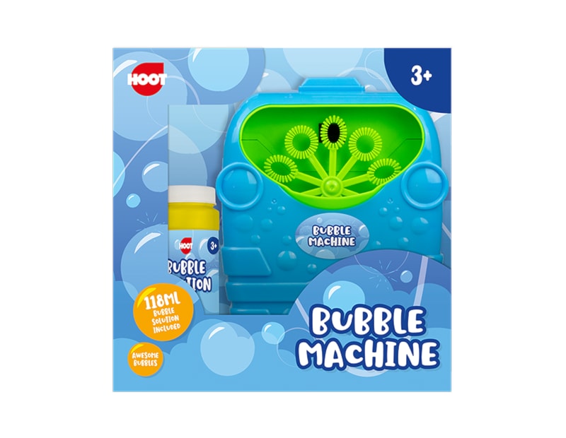 Bubble machines provide endless amounts of fun for kids (3+). The bubble machine features a rotating bubble dispenser. Once the button at the top of the machine is pressed the filled reservoir will continuously feed the bubble wands dispersing bubbles into the air.