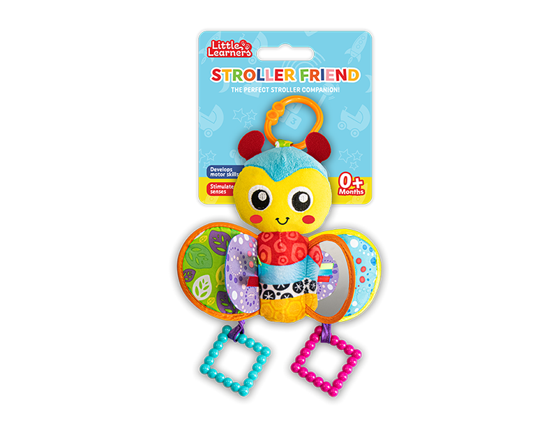 This butterfly friend clips onto strollers and push chairs to keep baby entertained. Each butterfly is plush with an embroidered face, and features a mirror on one wing, and ribbons and fabrics of different textures on the other wing, with two plastic beads dangling down.
