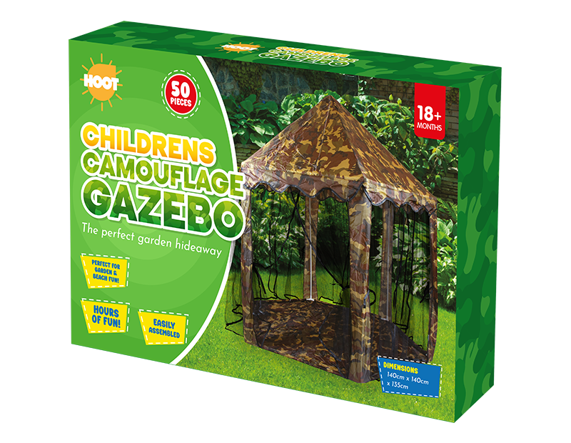 This fun camouflage print gazebo can be used indoor or outdoor, in the garden or on the beach, and is ideal for imaginative play time, parties, sleepovers and more!