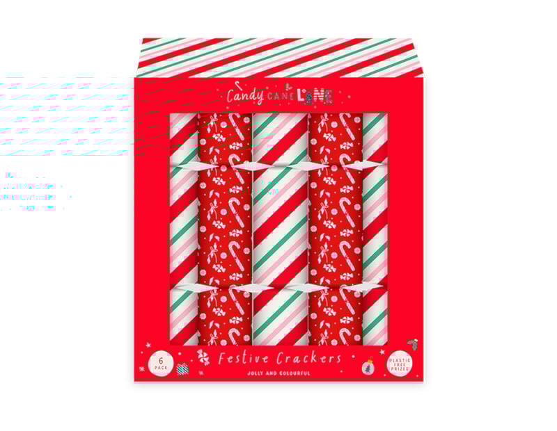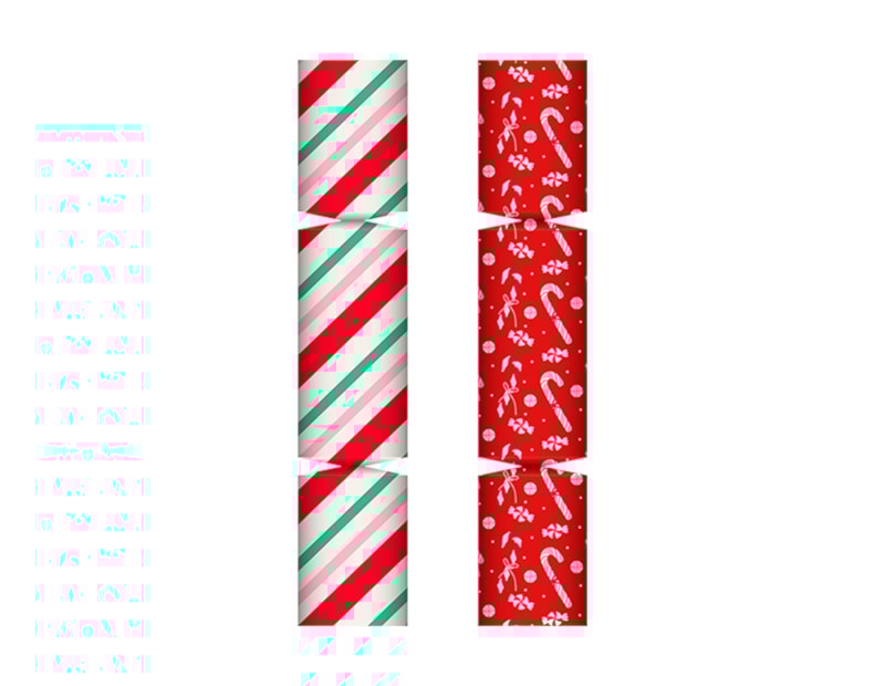 Each cracker is beautifully designed with jolly and colourful candy cane themed christmas colours and motifs, and red ribbon ties for a luxurious touch.