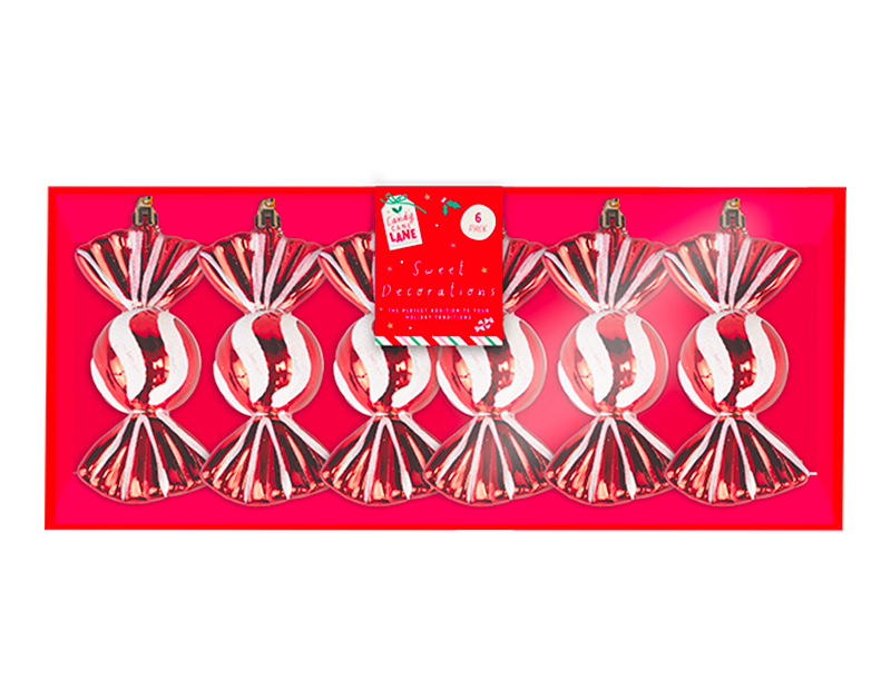 Each pack comes with six individual baubles, shaped like sweet wrappers, featuring a red and white glittery design and complete with a hanging metallic thread.