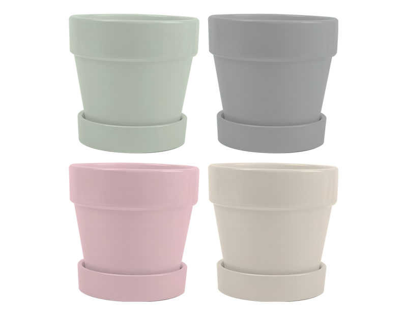 Each plant pot is finished in a solid pastel colour and is complete with an attached saucer.