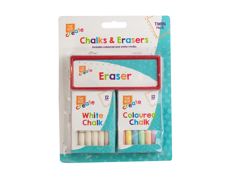 This Chalk & Eraser Set contains twelve white chalks and twelve coloured chalks that are 8cm in length.