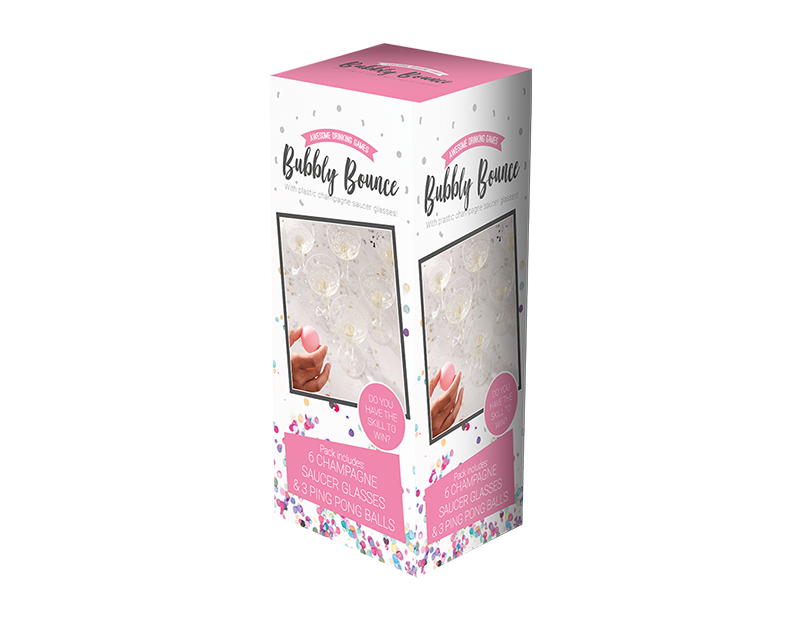 Each pong set contains six plastic champagne saucer glasses and three ping pong balls.