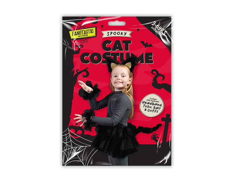 Each costume comes in one size: 3-6 years. and includes a glittery cat ears headband, 2 x two tiered mesh wrist cuffs, a detachable velcro furry tail and a three layered mesh tutu with elasticated waistband.