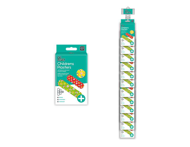 This pack of bright and colourful Children's Plasters contains sixty individually wrapped plasters that are assorted shaped and complete with a fun children's design, certain to put smiles back on faces.