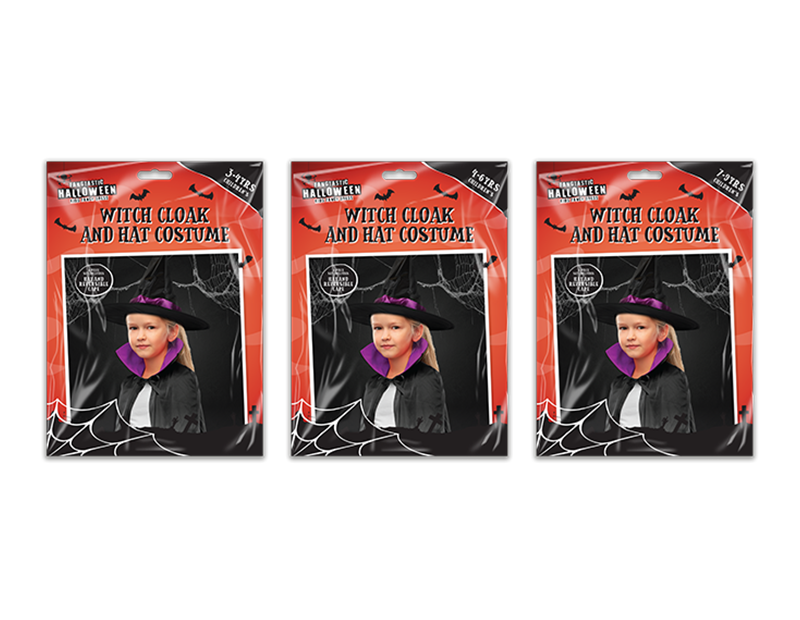 Look no further for the perfect childs halloween costume. Each pack comes with a reversible cloak and hat with purple detailing for a simple yet effective witch costume.