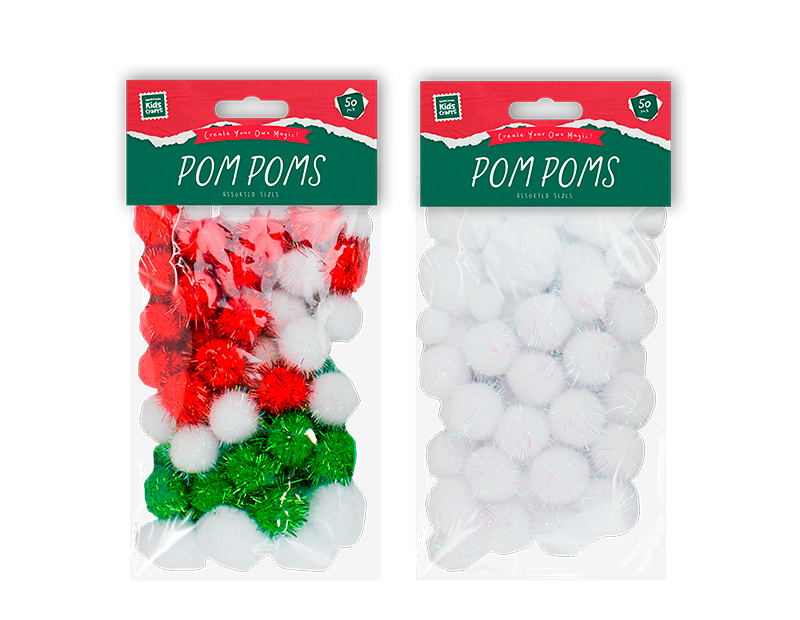 This pack of Christmas Craft Pom Poms contains fifty pom poms in assorted sizes and includes the colours, white, white/silver, green and red.