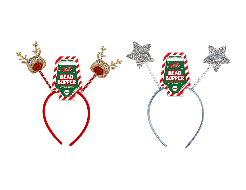 These fun adult Christmas Glitter Head Boppers consist of a felt covered headband with two spring mounted Christmas themed boppers.