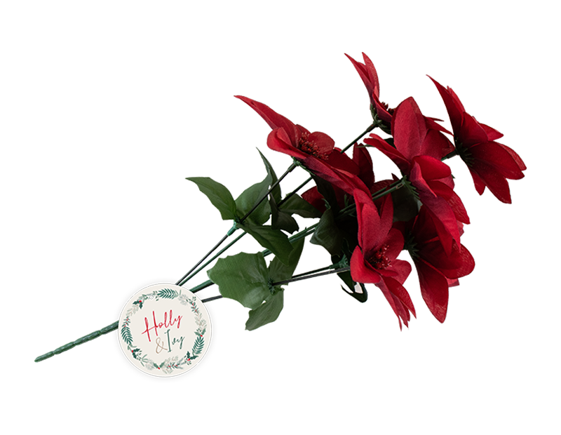 This Christmas Glittered Poinsettia Spray has seven heads featuring red polyester flowers with glittered centres. Each stem has a steel wire running within it so head position can be customised.