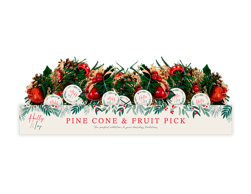 These Christmas Pine Cone & Fruit Pick decorations are constructed from plastic and PVC, and feature decorative bells, berries and baubles.