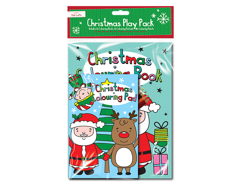 Set contains a 21cm x 27.5cm colouring book comprising eight festive designs; a smaller 14cm x 21cm colouring pad; and four colouring pencils in the colours green, blue, red and yellow.