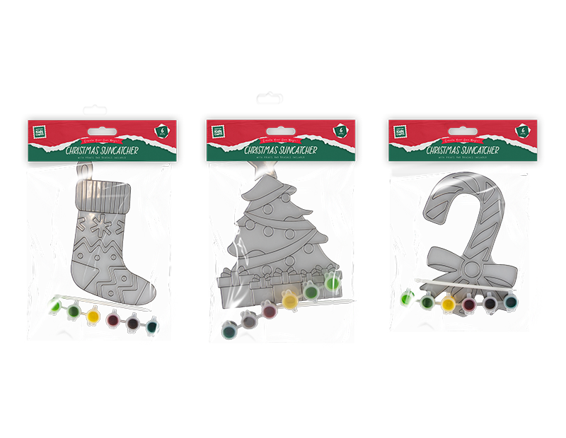 Create some Christmas magic! These Christmas suncatchers are great for hanging in windows once painted. Each clear suncatcher comes complete with six paints and a paintbrush.