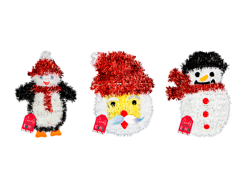 These Christmas Tinsel Wall Plaques are built onto a plastic frame and feature a tinsel covering with attached decorative embellishments.