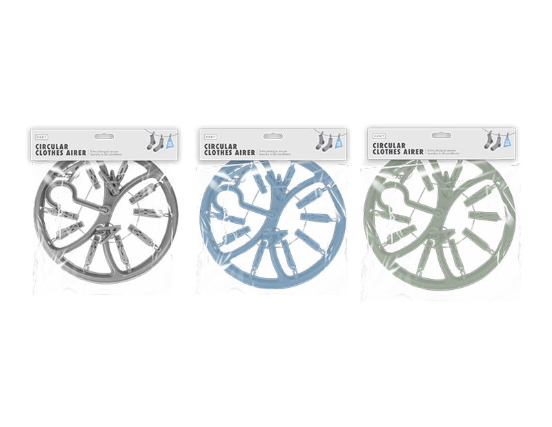This circular clothes airer is idea for drying smaller garments such as socks and underwear. Each airer contains 12 pegs and has a large hook to hang up on washing lines.