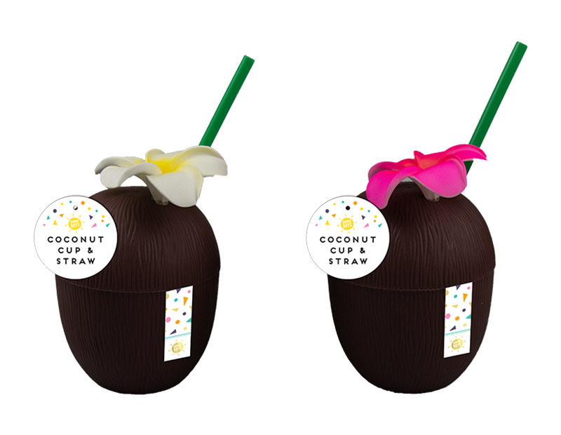 Each Coconut Cup includes a drinking straw and comes with a decorative coloured flower.