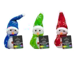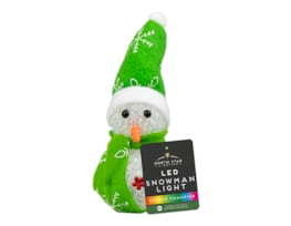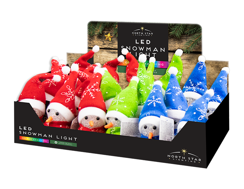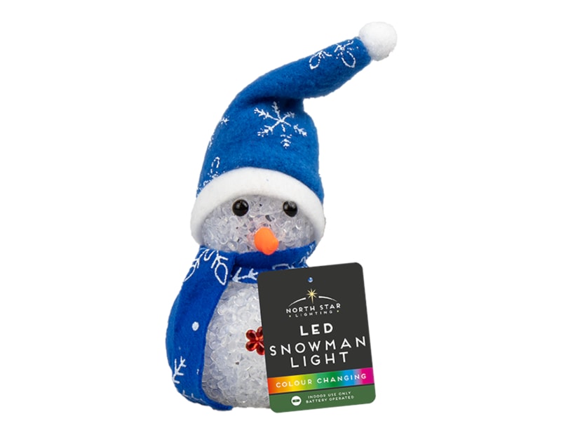 This battery operated Colour Changing LED Snowman is constructed from flexible plastic and features a polyester hat and scarf, and plastic accessories.
