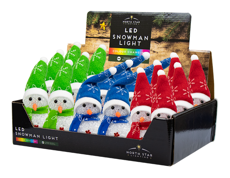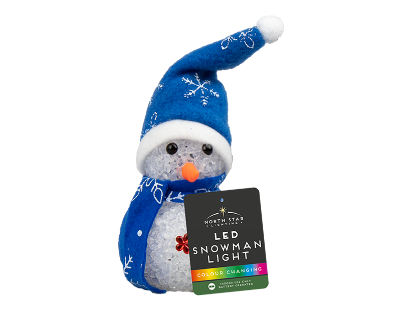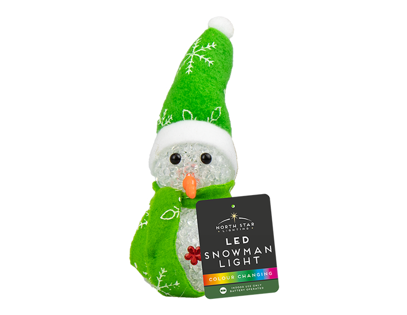 This battery operated Colour Changing LED Snowman is constructed from flexible plastic and features a polyester hat and scarf, and plastic accessories.