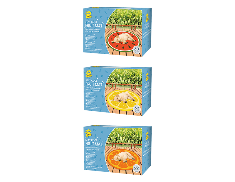 These "Stay cool" fruit mats will be a dog's best friend during the summer months. Each mat measures 60 cm in diameter and requires minimal maintenance. Each mat automatically cools once the pet is sat on it using a non-toxic gel.