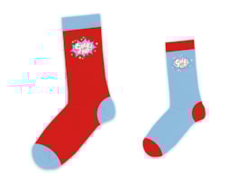 Each set includes two mugs and two pairs of socks. 'Super Dad!' printed socks (size 7-9) and mug for dad, and 'Super Kid!' printed socks (childs size 6-12) and mug for the child.
