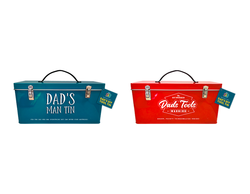 Each carton contains two assorted designs; 'Dad's Tools' and 'Dad's Man Tin'.