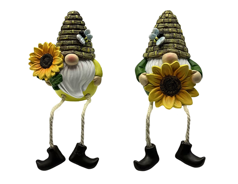 Each ornament measures approx H17 x W8 x D6cm, and are made of durable resin painted with bright colours, and features dangly string legs and is holding a sunflower. Perfect for sitting on windowsills and walls.