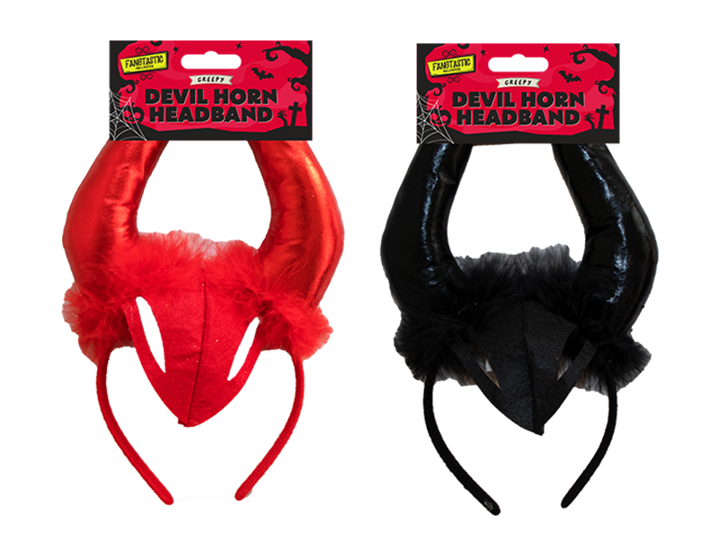 The headband consists of a fabric covered plastic band with two built in devil horns that are made from soft shiny fabric and feature feathers at the base.