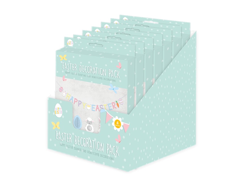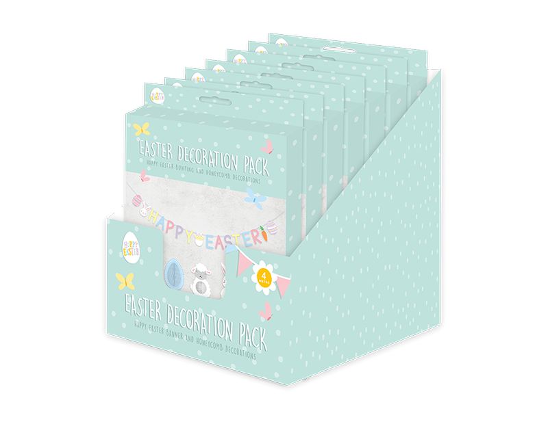 Each pack contains a 'Happy Easter' bunting, 5 x honeycomb decorations and 4m of ribbon. Each banner decoration is printed on both sides.