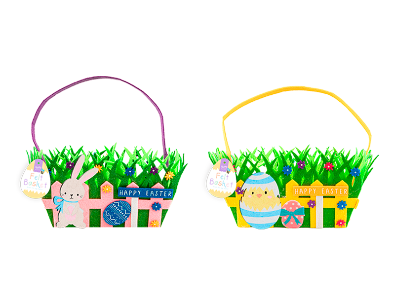 Each basket has a 100% felt construction and is designed to look like an easter meadow featuring grass, flowers, fences and egg hunt signs, with a fun Easter character.