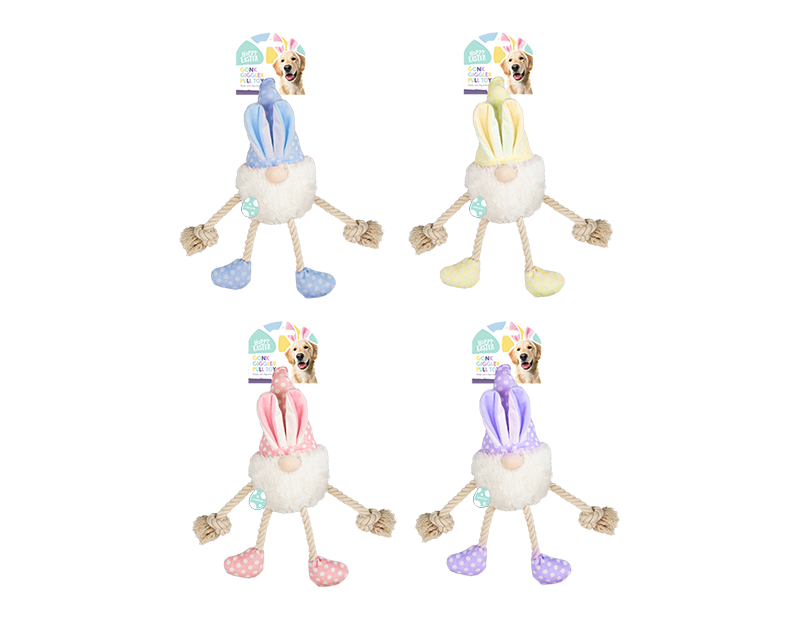 Each gonk toy features a supersoft fluffy bearded body, polkadot hat and shoes, attached bunny ears and sturdy rope arms and legs. Inside the main body is a plastic giggler that makes noise when the toy is shook.