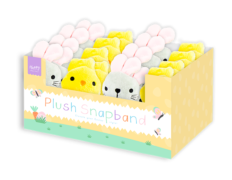 Fun Easter snap bands with a plush face, each snap band features an Easter-themed character. When snapped against the wrist the band curves to fit the wrist.