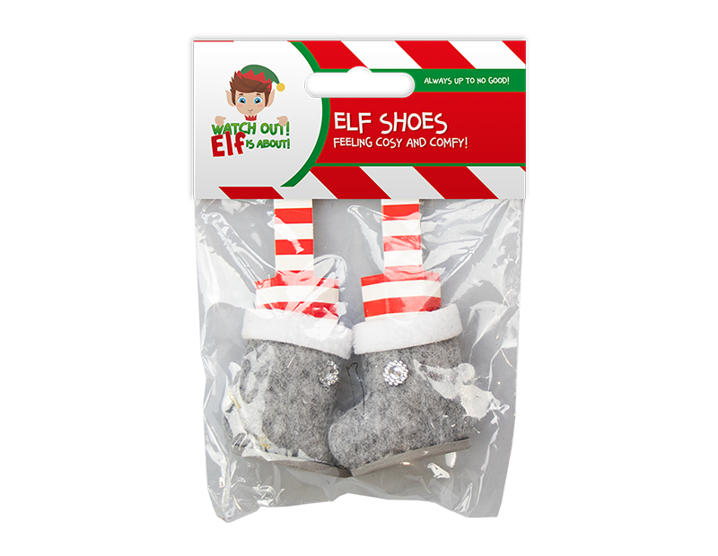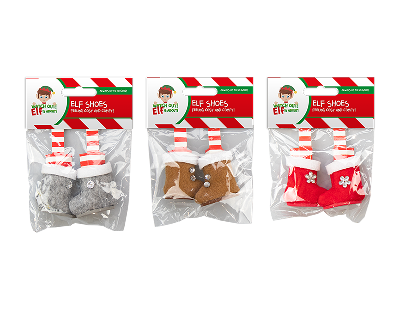 These Elf Shoes are constructed from soft polyester in either red, brown or grey, and are complete with diamanté buttons and white trim.
