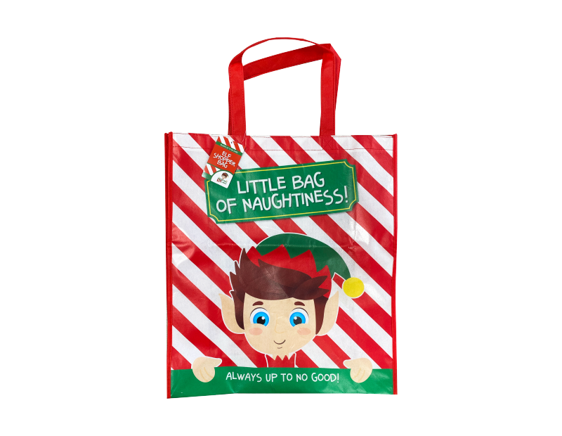 Each shopping bag has an opened size of 45cm x 40cm x 14cm and features a colourful printed elf design.